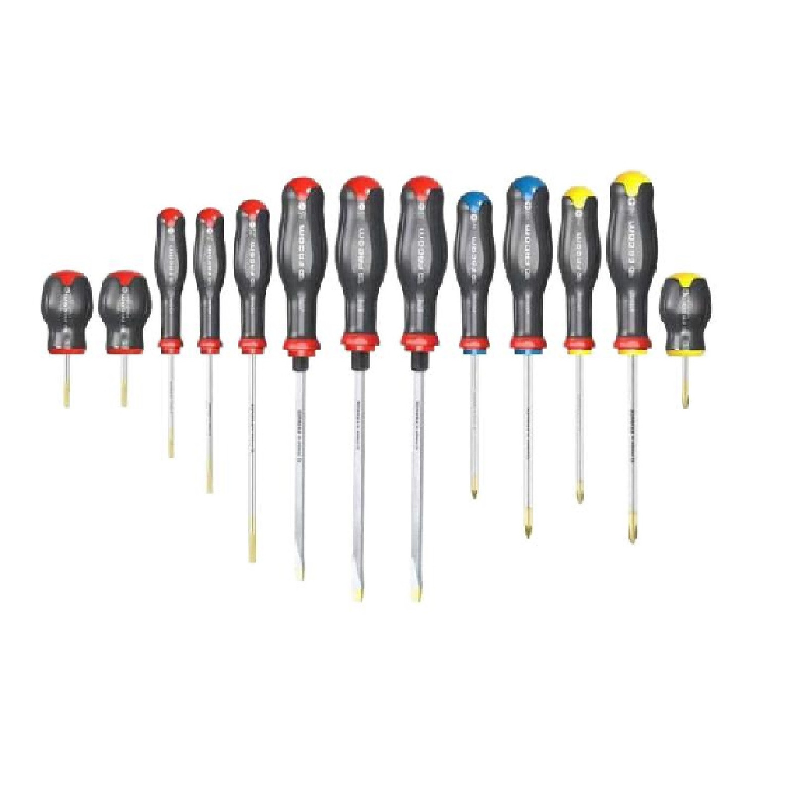 3 tournevis plats : 2.5x75, 4x100, 5.5x125 mm. 2 tournevis plats-serie power : 6.5x150, 8x175 mm 3 Phillips®: 0x75, 1x100, 2x125.2 Pozidriv®: 1x100, 2x125.