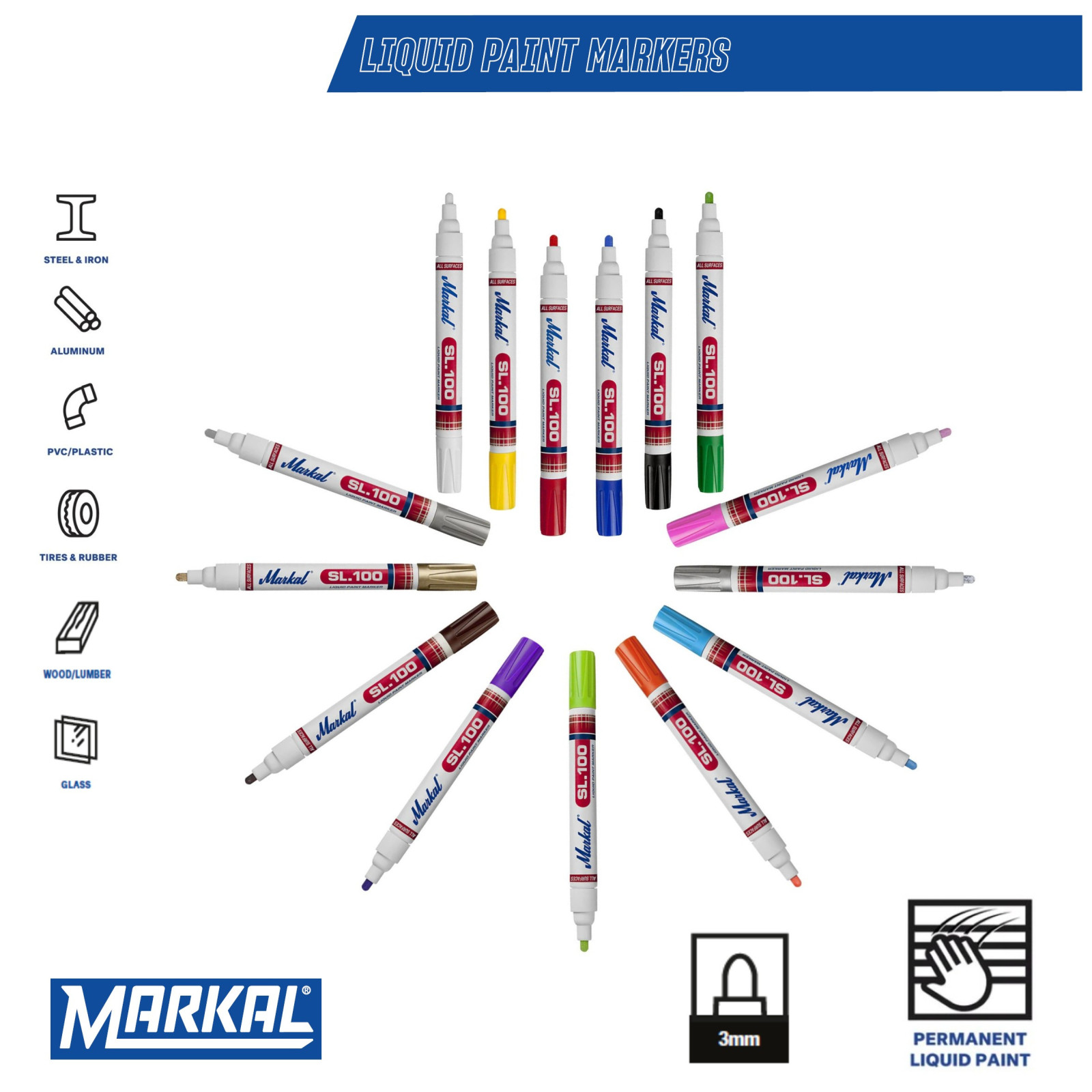 Le marqueur SL.100 de chez MARKAL® est un marqueur à peinture liquide rapide à sécher sans xylène et à faible odeur. Il est conçu pour laisser des marques durables sur presque toutes les surfaces.