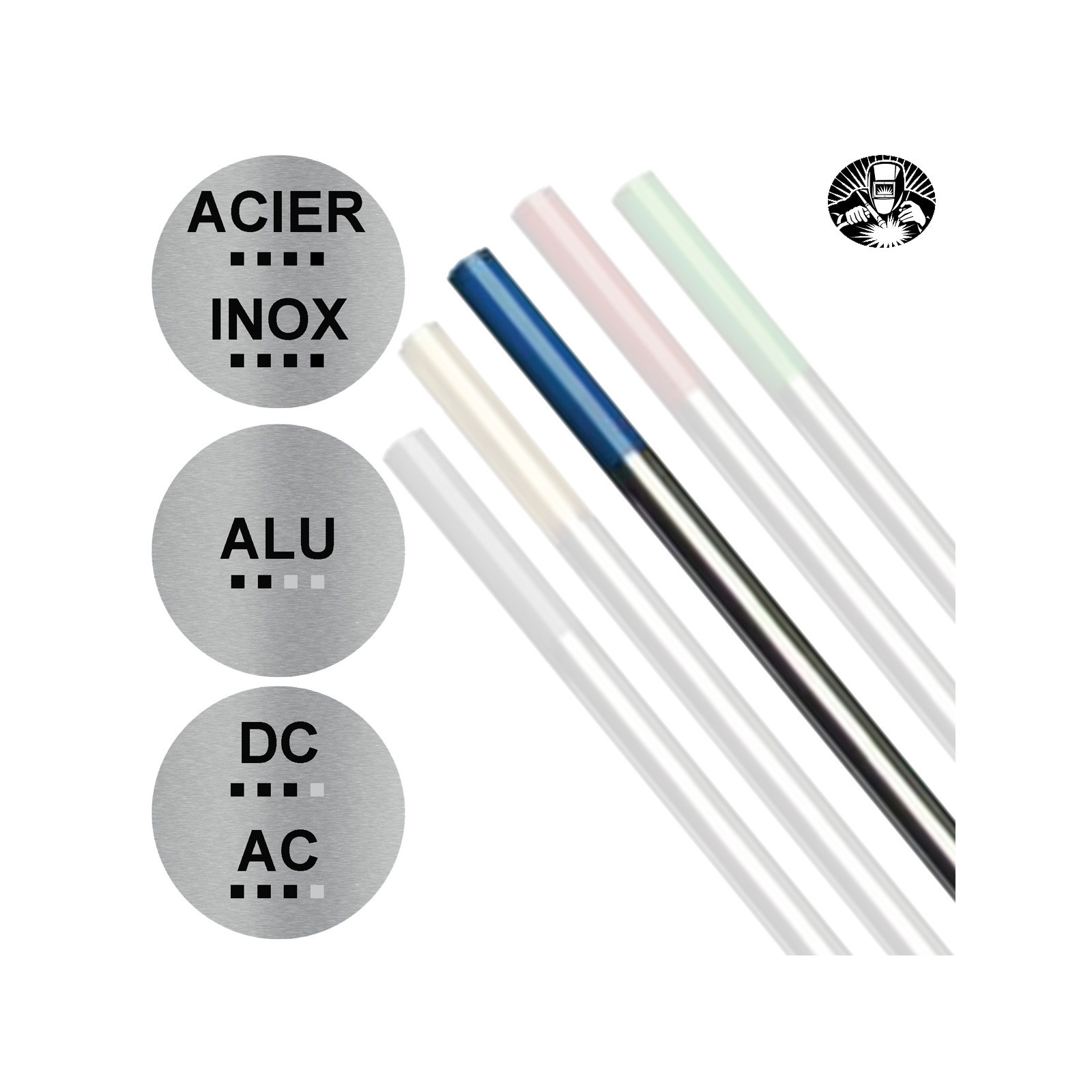 Électrode polyvalente. Excellent allumage de l'arc et très bonne stabilité.Convient pour l'utilisation à la fois sur AC ou DC. Elle fonctionne très bien pour le soudage de l'acier en carbone, inoxydable,l'aluminium, le magnésium, titane...