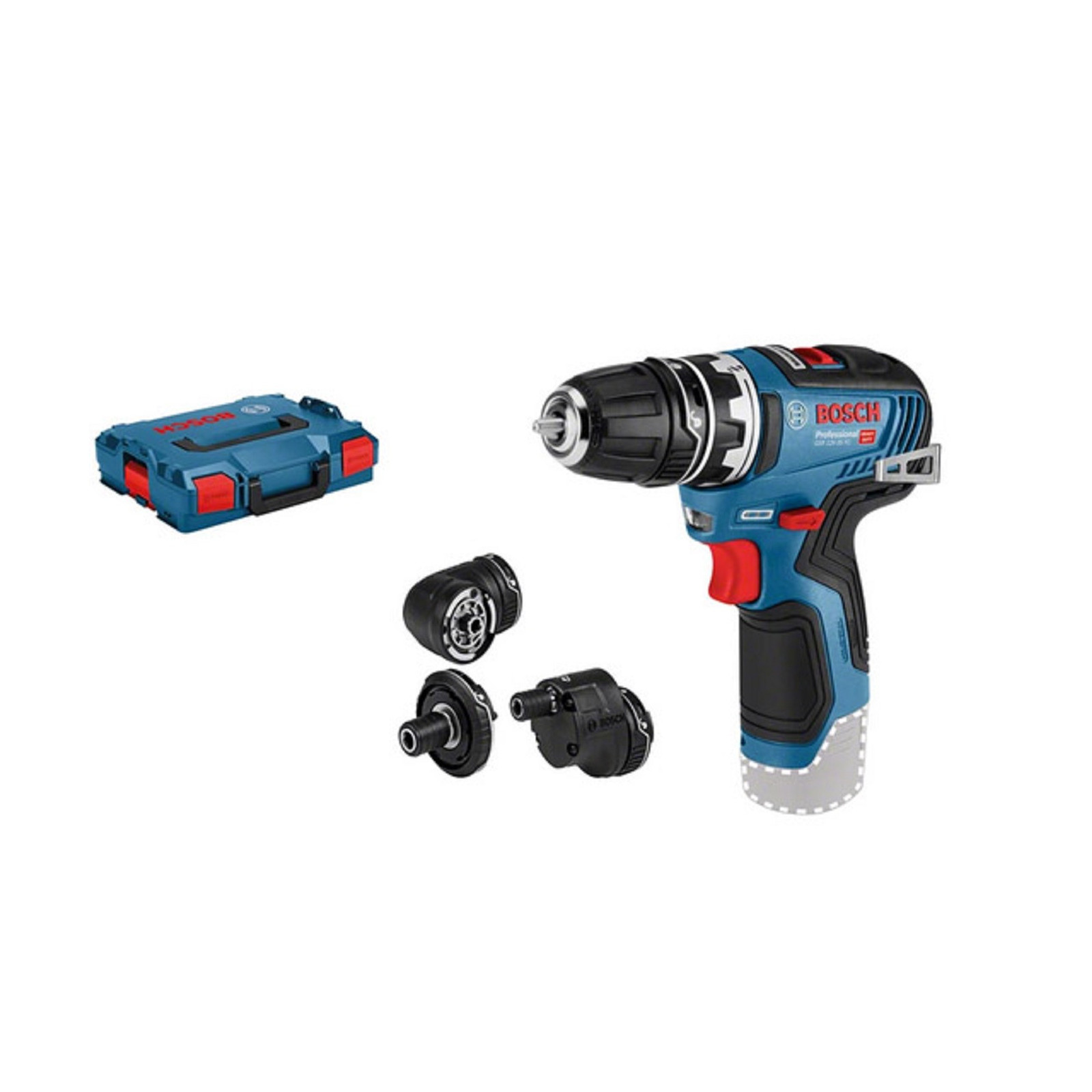 La perceuse-visseuse sans fil GSR 12V-35 FC Professional est l'outil le plus polyvalent de la catégorie 12 V de Bosch. Elle est équipée d'un moteur sans charbon offrant un couple de 35 Nm et un régime à vide de 1 750 tr/min, garantissant une performance élevée. Son système FlexiClick innovant comprend quatre adaptateurs interchangeables — mandrin 10 mm, porte-embout verrouillable, renvoi d'angle et mandrin excentré — permettant huit configurations différentes pour s'adapter à diverses applications.