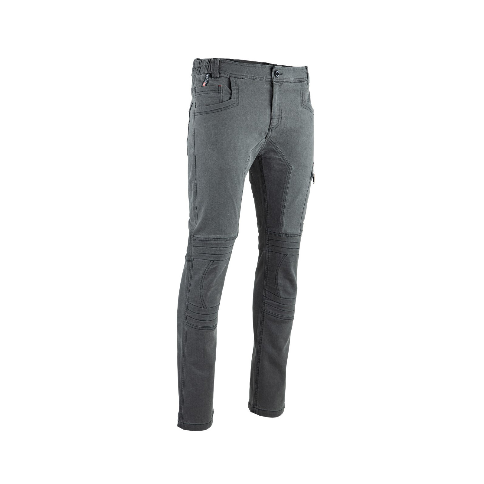Les genoux et l'entrejambe sont renforcés pour offrir une résistance accrue. Les renforts matelassés sur les genoux, réalisés dans la même matière, sont mis en valeur par un jeu de surpiqûres, tandis que l'entrejambe renforcé bénéficie de triple surpiqûres pour une solidité maximale.