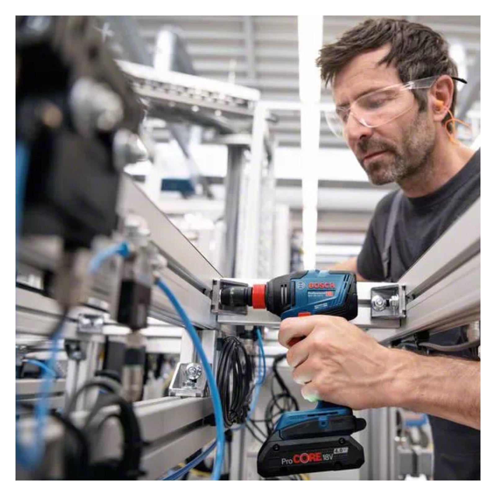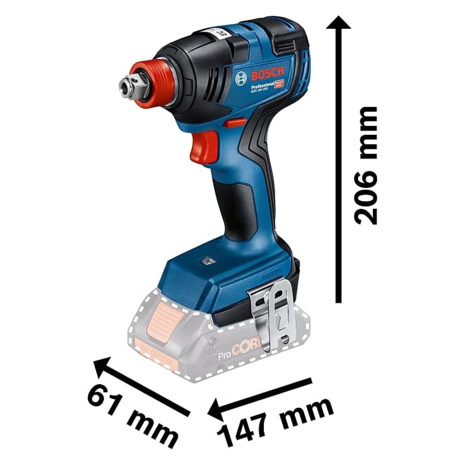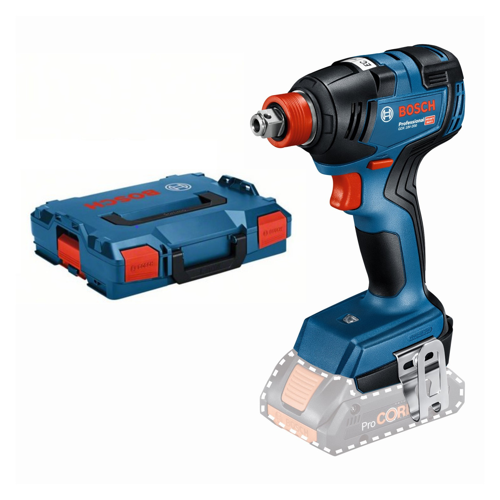 Elle est équipée d'un emmanchement hexagonal de 1/4" qui peut accueillir une large gamme d'embouts de vissage, ce qui permet une grande flexibilité lors de l'utilisation de différents types de vis. La BOSCH GDX 18V-200 dispose également d'un emmanchement 1/2" pouvant accueillir des douilles de serrage pour les boulons et les écrous.