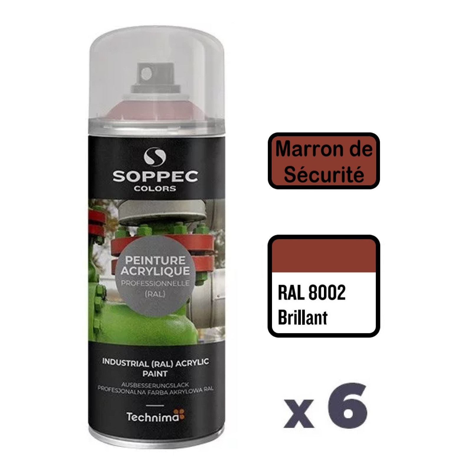 6 Peintures Acryliques Aérosol 520 ML Marron Sécurité - 8002 SOPPEC AEROPM8002SEC Agrandir l'image
