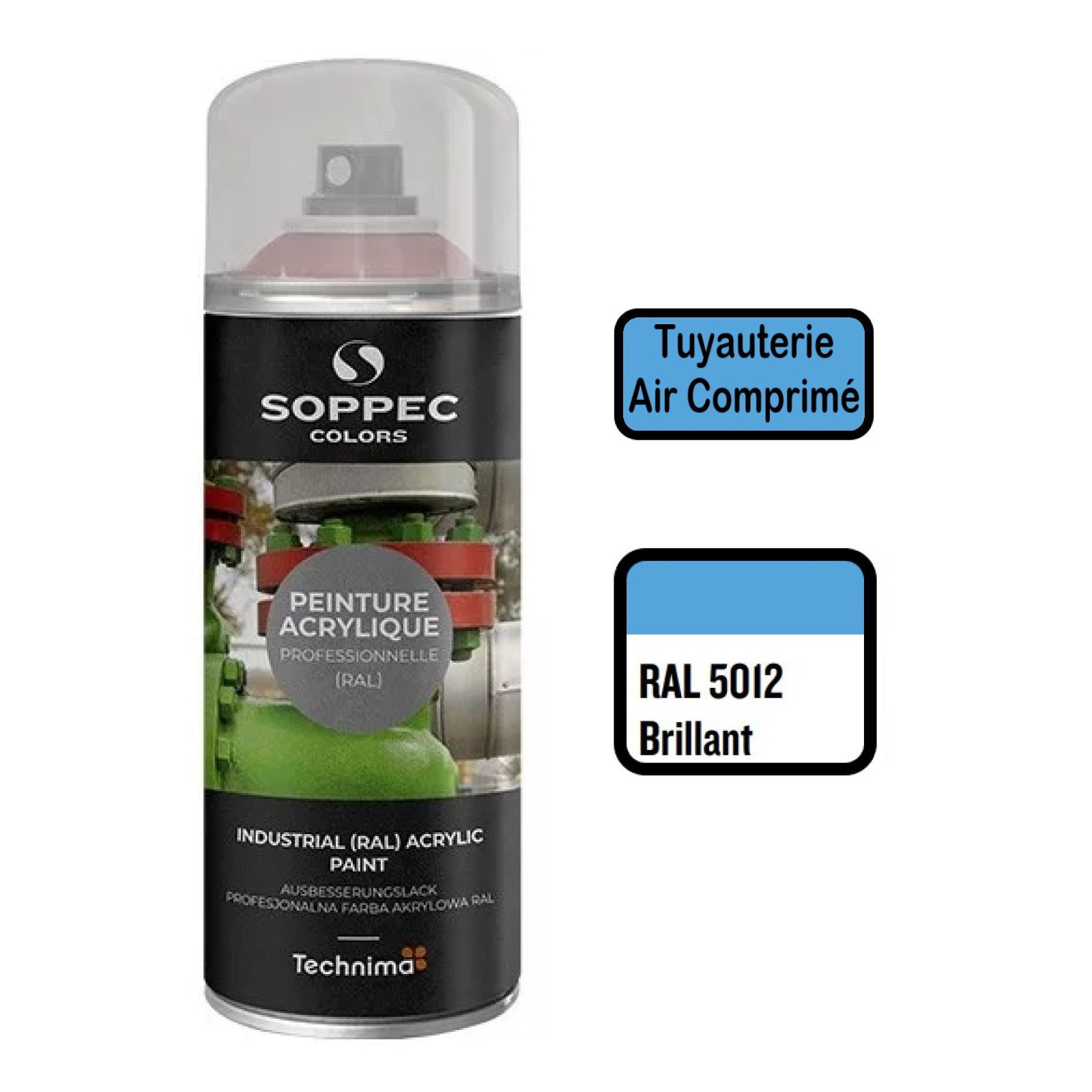 La peinture acrylique en aérosol SOPPEC Colors éxiste dans la plupart des nuances de RAL et se décline aussi bien en brillant, mat ou satin. Elle se décline également dans la quasi-intégralité des RAL spécifiques pour la sécurité, la signalisation ou l'identication des tubulures de fluide (Gaz, Air, Eau, Vapeur ...).