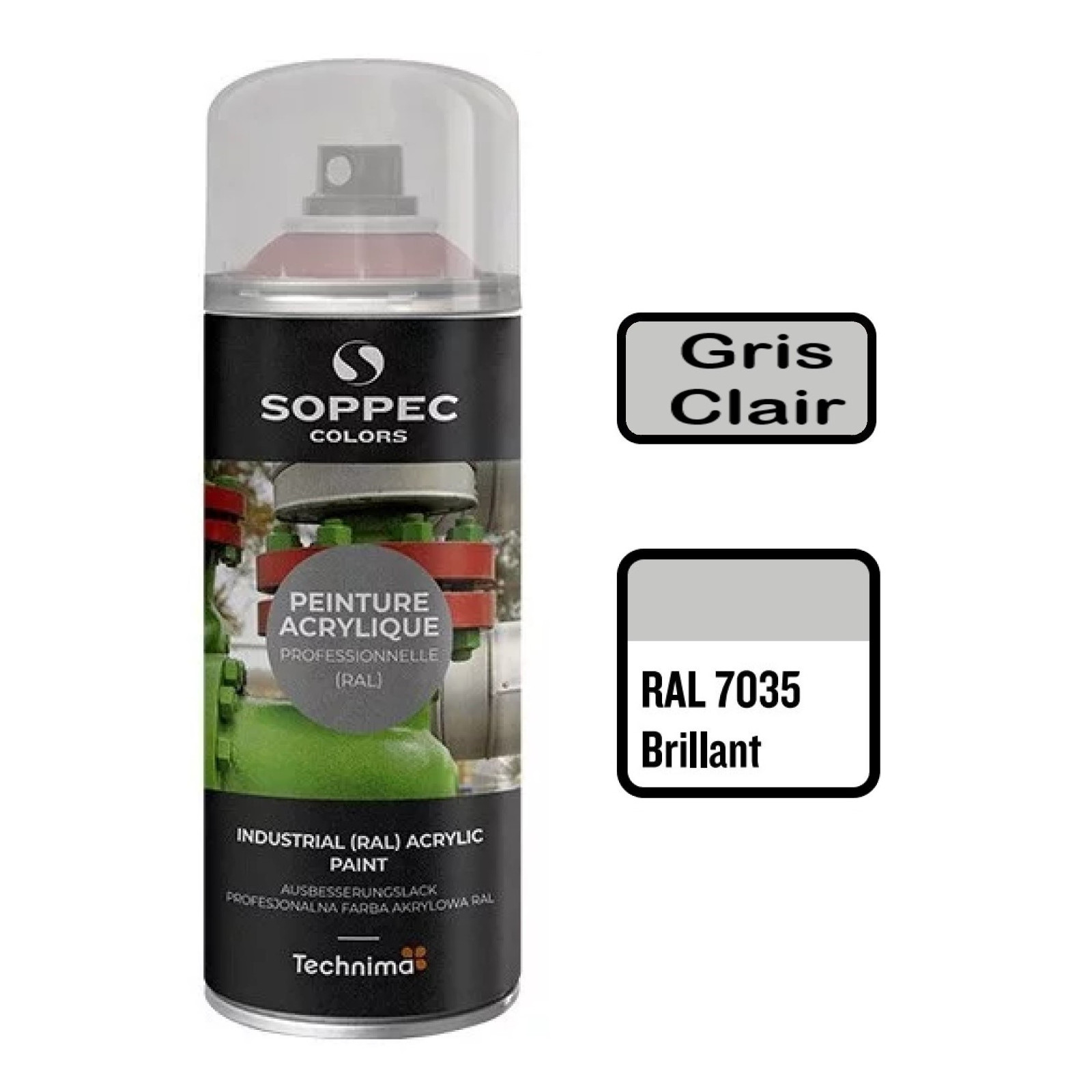 La peinture acrylique en aérosol SOPPEC Colors éxiste dans la plupart des nuances de RAL et se décline aussi bien en brillant, mat ou satin. Elle se décline également dans la quasi-intégralité des RAL spécifiques pour la sécurité, la signalisation ou l'identication des tubulures de fluide (Gaz, Air, Eau, Vapeur ...).