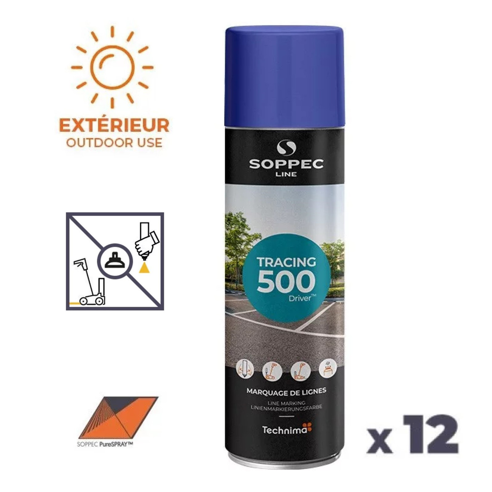 Le traceur de ligne Tracing 500 aérosol SOPPEC est disponible en plusieurs couleurs vives, y compris le blanc, le jaune, le rouge, le bleu, le vert et le noir, ce qui permet de créer des marques visibles et durables. Il est équipé d'une buse réglable qui permet de choisir la largeur de la ligne tracée, allant de 50 à 100 mm, en fonction des besoins.