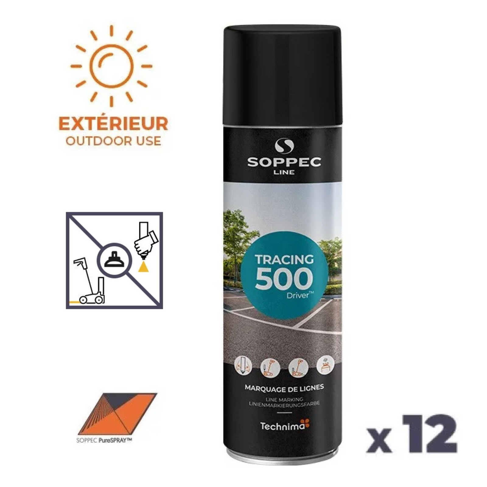 Le traceur de ligne Tracing 500 aérosol SOPPEC est disponible en plusieurs couleurs vives, y compris le blanc, le jaune, le rouge, le bleu, le vert et le noir, ce qui permet de créer des marques visibles et durables. Il est équipé d'une buse réglable qui permet de choisir la largeur de la ligne tracée, allant de 50 à 100 mm, en fonction des besoins.