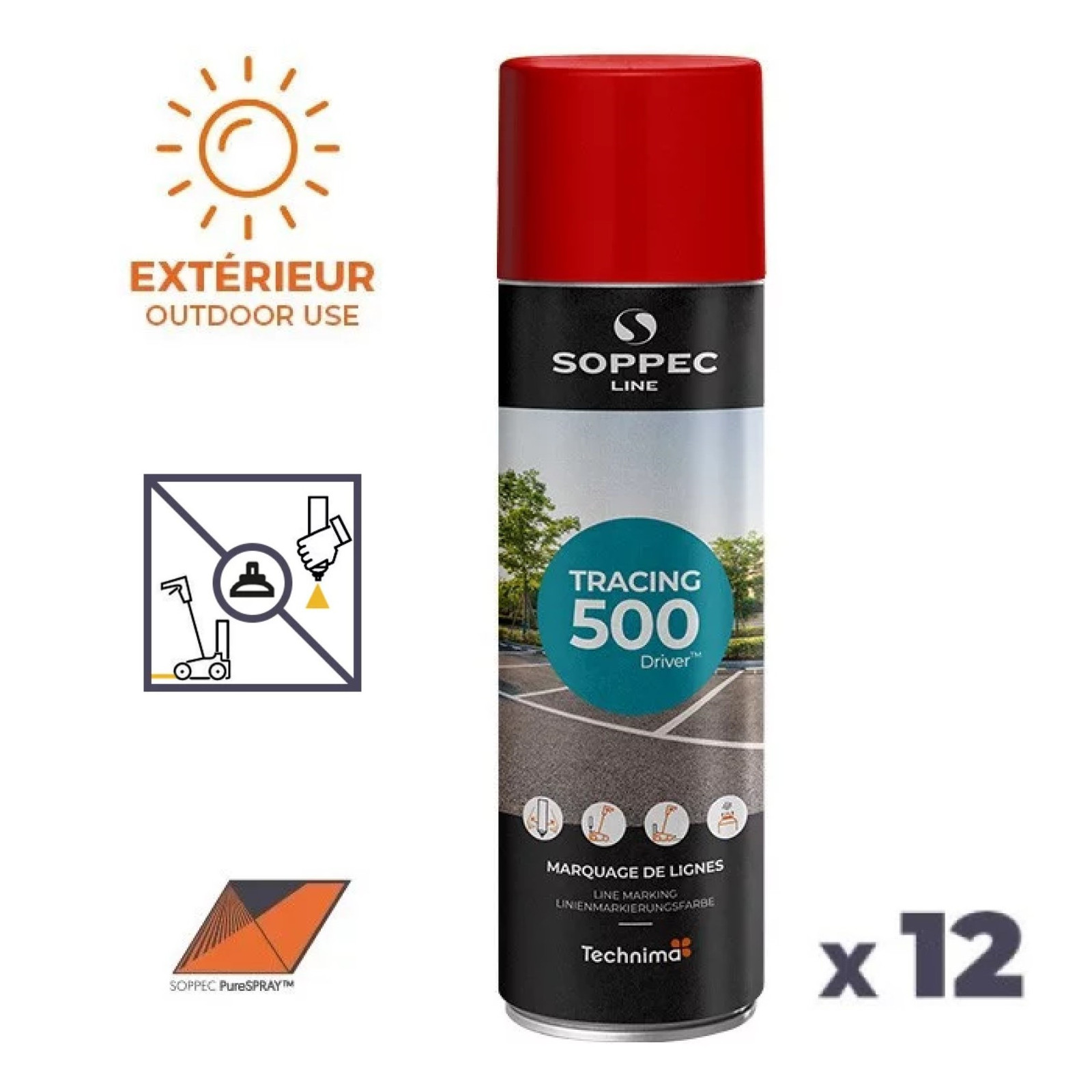 Le traceur de ligne Tracing 500 aérosol SOPPEC est disponible en plusieurs couleurs vives, y compris le blanc, le jaune, le rouge, le bleu, le vert et le noir, ce qui permet de créer des marques visibles et durables. Il est équipé d'une buse réglable qui permet de choisir la largeur de la ligne tracée, allant de 50 à 100 mm, en fonction des besoins.