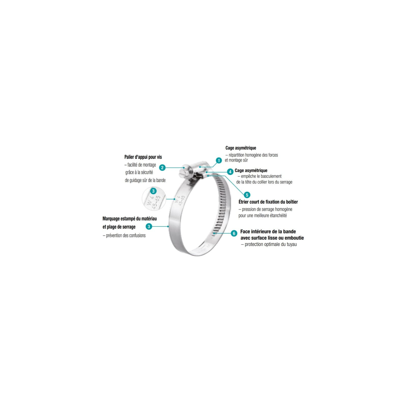 - Mécanisme de serrage : vis de serrage tête hexagonale fendue en acier inoxydable avec un feuillard embouti de verrouillage spéciale pour un maintien sûr et rapide.