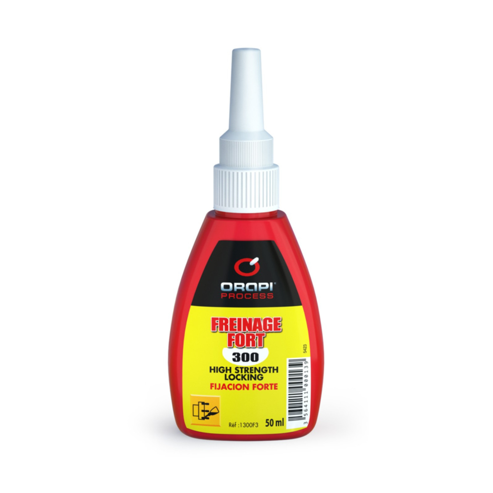 ORAPI 300 est une résine anaérobie de couleur vert et d'un aspect liquide visqueux, spécialement formulée pour le freinage et le scellement des assemblages filetés métalliques (vis, écrous, goujons, boulons, etc.). Elle polymérise en absence d’air et au contact des métaux, formant un joint solide qui empêche le desserrage dû aux vibrations, tout en restant démontable avec des outils classiques.