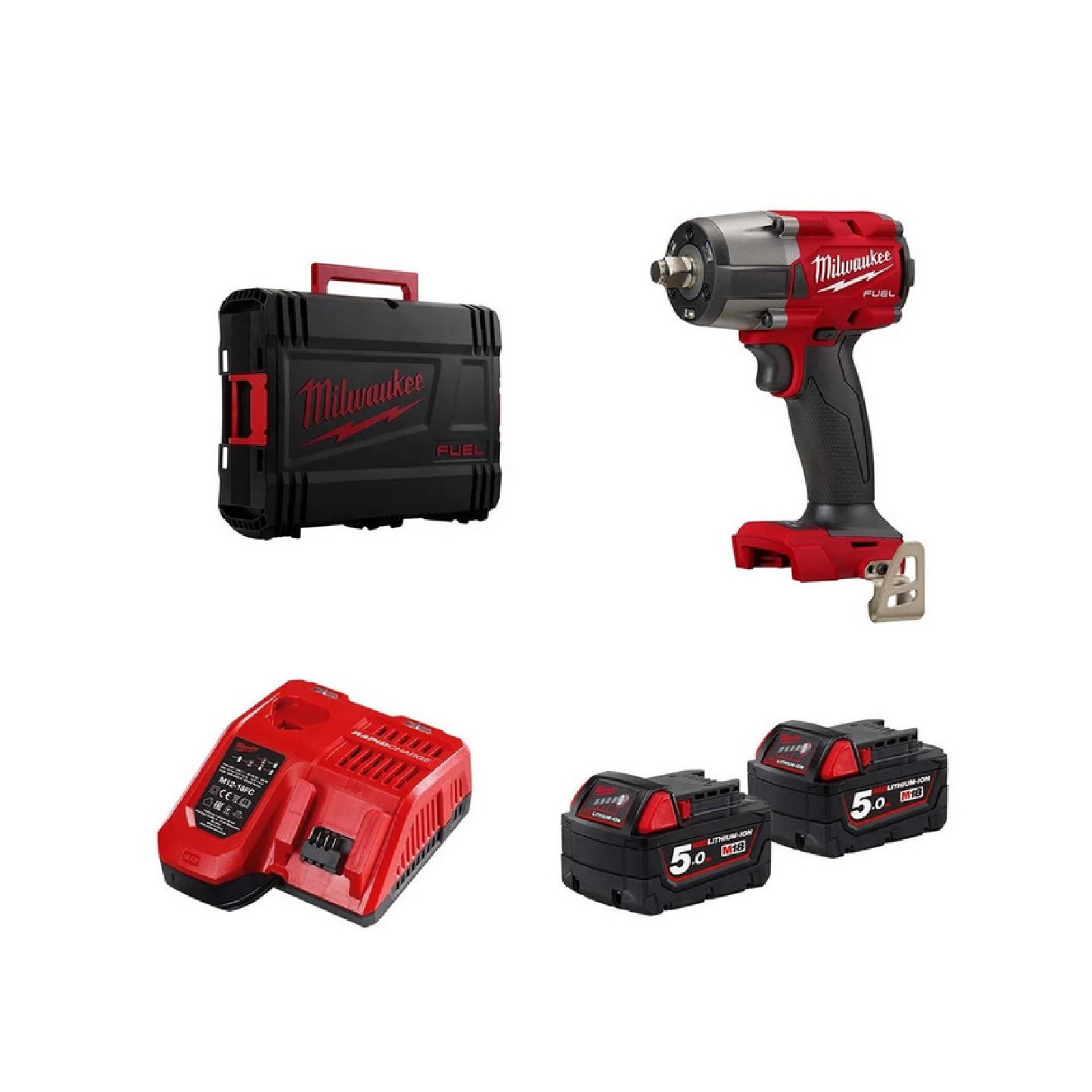 livré avec un pack de batteries 2 x M18 B5, un chargeur M12-18 FC et une boite de transport HD Box.
