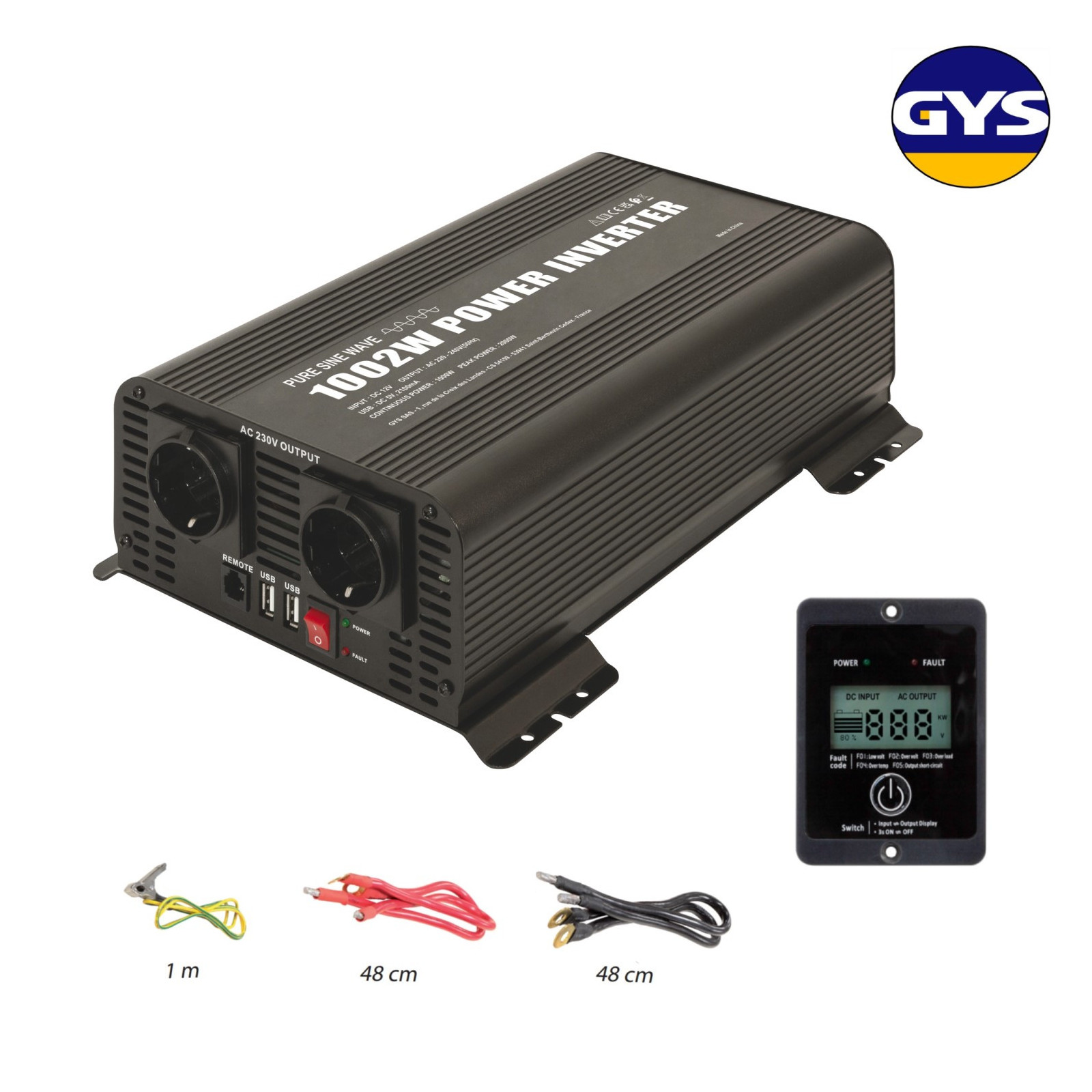 Le convertisseur de tension PSW 1002W RC-12 s’alimente par liaison câbles (+ & -) de 48cm et une liaison prise de terre. En plus de ses 2 prises 230V, 2 ports USB (5V) permet de connecter les appareils de type lecteurs MP3 ou appareils photos. Sa télécommande vous permettra la mise sous tension de l'appareil ainsi que de visualisé les défauts par un écran digital à distance.