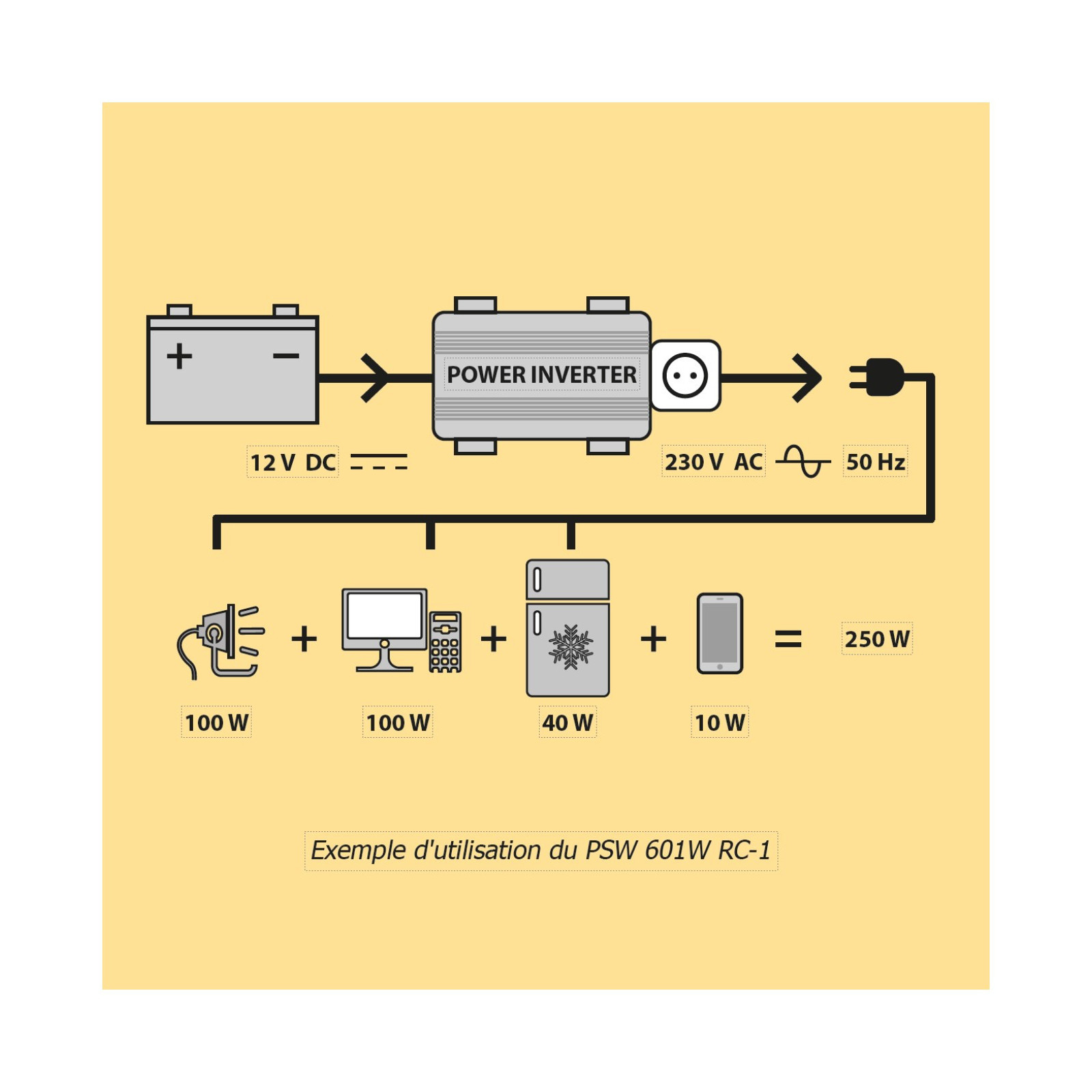 Il permet à partie d'une source de courant continu (Batterie 12V plomb ou Lithium …) d'alimenter en courant alternatif (230 Vac) diverses équipements électriques de type chargeur de batterie outils électroportatifs, smartphones, glacières jusqu'à une puissance de 600 watts.