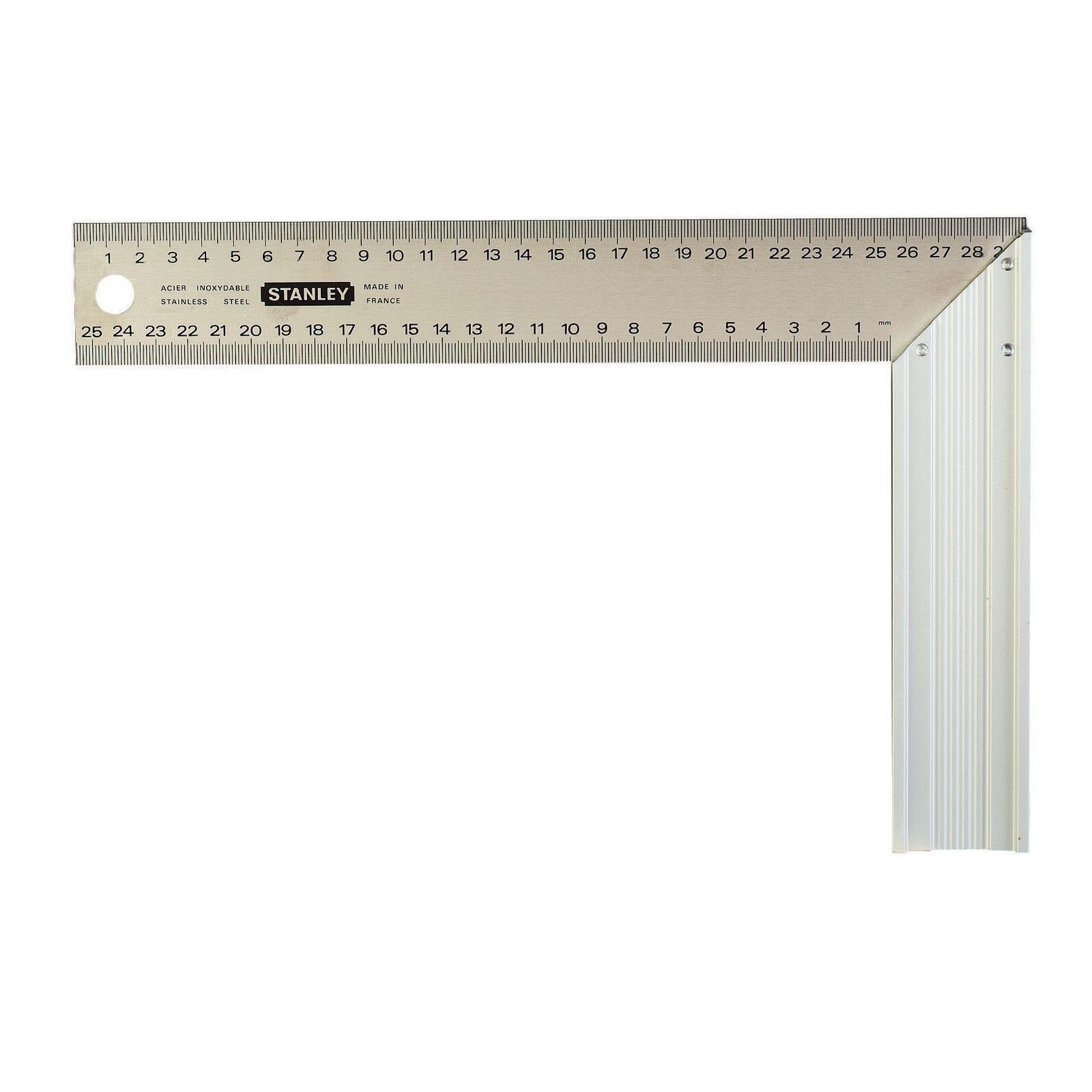 La lame de l'équerre est en acier inoxydable, ce qui la rend résistante à la corrosion et durable pour un usage prolongé. Le talon est en aluminium assurant une prise en main solide et confortable.