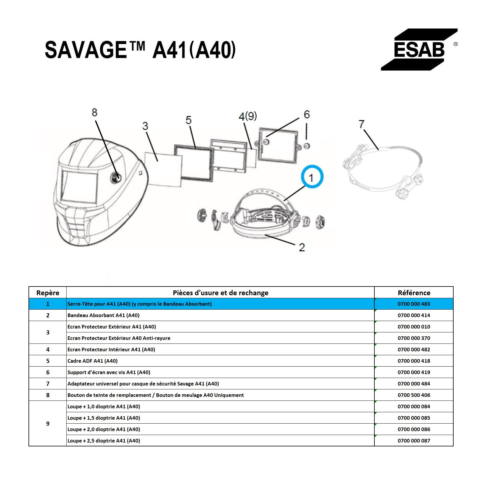 - Type : Bandeau cagoule de soudage,- Marque : ESAB®,- Modèle : Savage™ A41 (A40),- Couleur : Noire,- Matière : Eponge polyesther,- Conditionnement : 2 Pièces,- Poids : 170 Gr,- Garantie : Garantie légale de conformité.