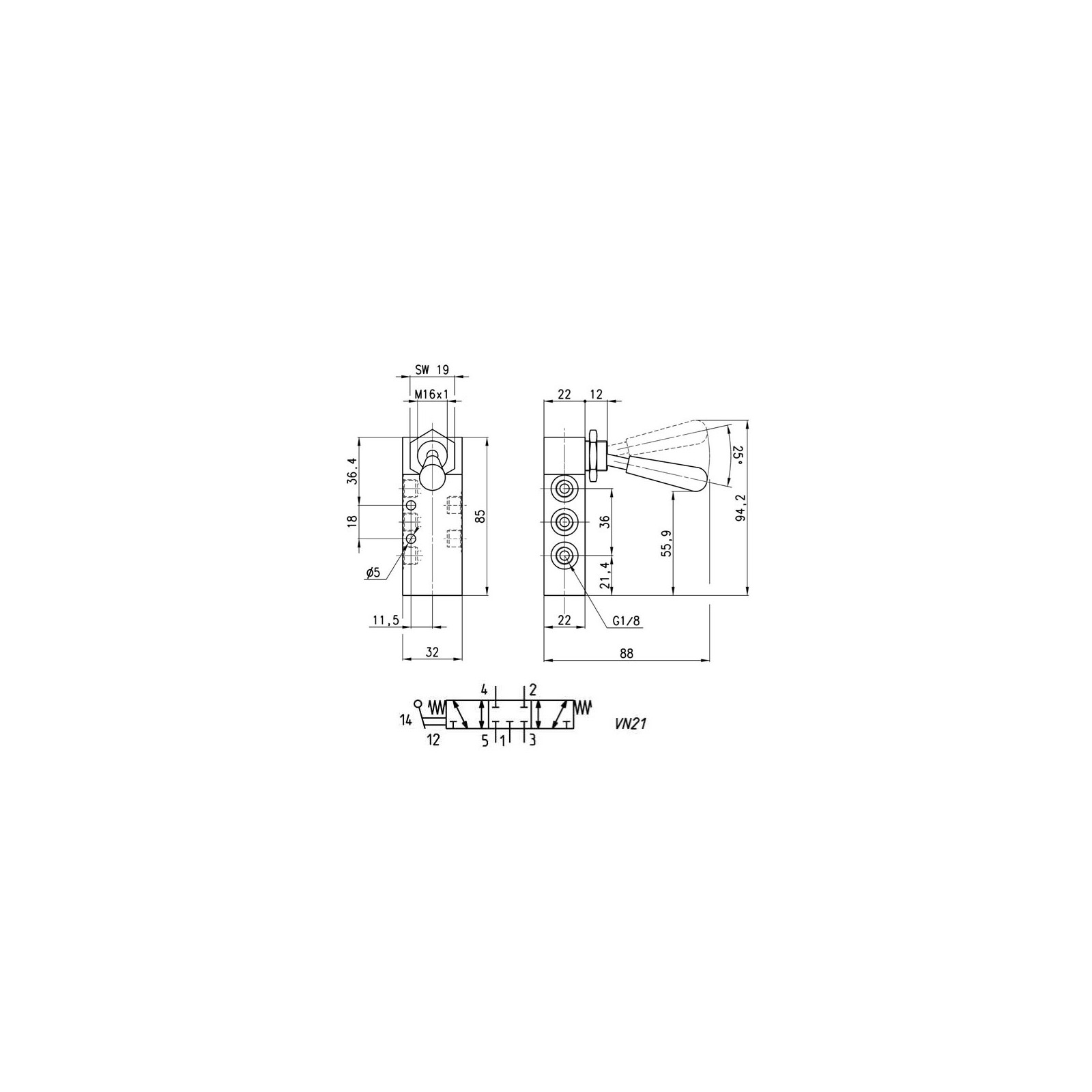 ConstructionTiroirFonction5/2MatériauxCorps aluminium, clapet laiton (OT58), tiroir inox, joints NBRRaccordement1/8"ActionnementLevier à galet (rappel ressort mécanique)T° de fonctionnement0 à +60°CT° du fluide0 à +50°CPression de service-0,9 à 10 barDébit700 Nl/minForce d'actionnement17N